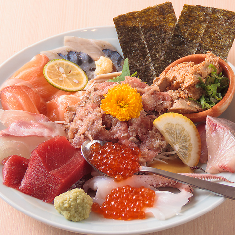 当店名物の百太郎盛りは、仕入れによって内容が変わるのでそのとき旬の鮮魚を1人前1000円以下でご提供!