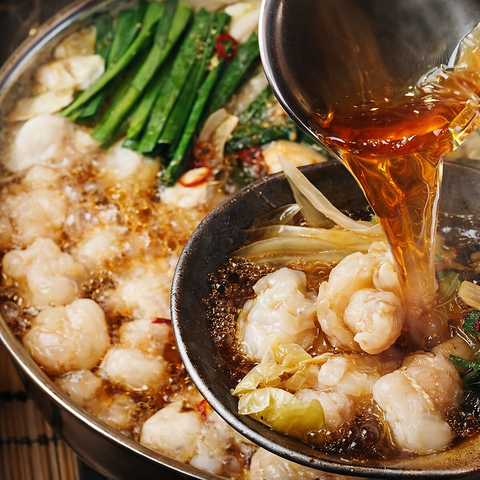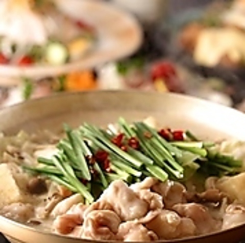 ぷりぷり食感の国産もつ鍋を中心に、前菜や彩りサラダ、明太チーズだし巻き卵、炭火焼き鳥、大山鶏の唐揚げなどを食べ放題で楽しめるコース。出汁にこだわった鍋は〆のラーメンまで味わえ、最後は季節のミニパフェで締めくくります。南越谷での宴会や集まりなど、さまざまな利用シーンに対応した内容です。