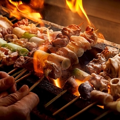 国産鶏,備長炭を使用した本格炭火焼き鳥は部位によって使用する鶏を使い分けており、素材に合わせた調理法と味付けでご提供するのが当店のこだわり◎部位ごとにしっかりと処理を施し、丁寧に脂を整え、旨味を閉じ込めて提供。肉厚な肉を串のままお召し上がりください♪自慢の串焼きは宴会コースでもお楽しみ頂けます