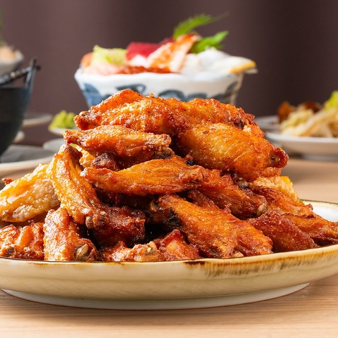 ジュワっと揚げたふっくら手羽先を、秘伝のタレや旨辛風味で丁寧に仕上げました◎外はカリッと香ばしく、中はジューシーな肉汁があふれる一品!噛むたびに鶏の旨みとタレの風味が口いっぱいに広がり、思わず悶絶してしまう美味しさです♪ビールやハイボールとの相性も抜群で、ついつい手が止まらなくなること間違いなし!