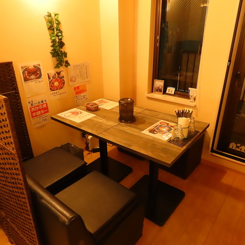 4名様掛けのテーブルもご用意。少人数でのご利用がしやすく、リラックスして食事が楽しめます。いつもの仲間とのお集まりや女子会などに最適です。美味しい料理に囲まれながら、心温まるひとときを過ごすことができるのが魅力的☆特別な時間を大切な仲間と共有してみてください!