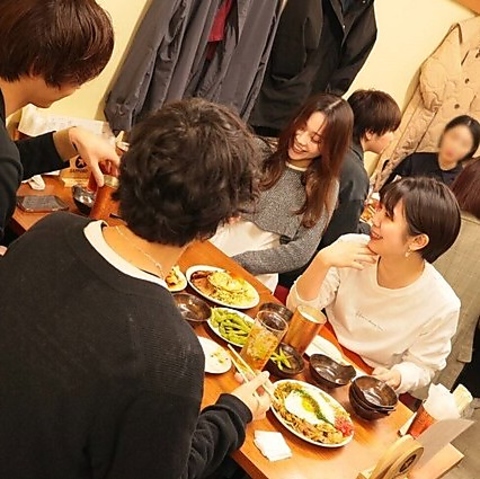 2~4名様掛けのテーブル席が11卓あり、お席のみのご予約も承っております!コート掛けもご用意しているので汚す心配なくお過ごしいただけます。明るく賑やかな雰囲気のお店で、飲むだけ・食事だけ・お酒とお食事両方と幅広くお使いいただけます。カウンター席もあり、お一人様でのご来店も大歓迎!ご来店心よりお待ちしております☆
