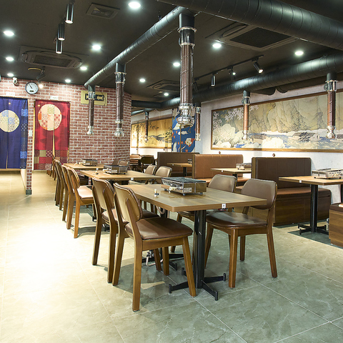 【テーブル席】開放的な空間のテーブル席で、気軽に食べ放題を楽しめます!隣の席との間も広く、広々店内をゆったりと使えるのも当店の魅力です♪換気筒で服ににおいがつきにくいのも嬉しい♪