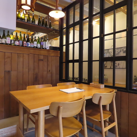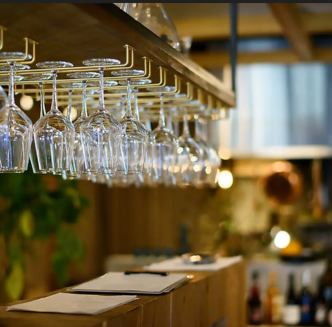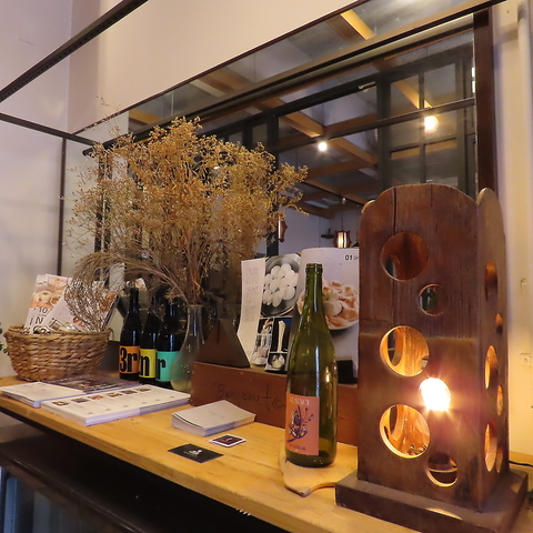 当店のバーカウンターは、スタイリッシュで洗練された雰囲気が漂います。吊り下げられたグラスが美しく整列し、訪れる人々の目を引きます。木の温もりと金属のアクセントが絶妙に調和し、居心地の良さを感じさせます。メニューが置かれたカウンターは、料理やワインを楽しむための特別な空間を提供。リラックスした雰囲気が広がります。