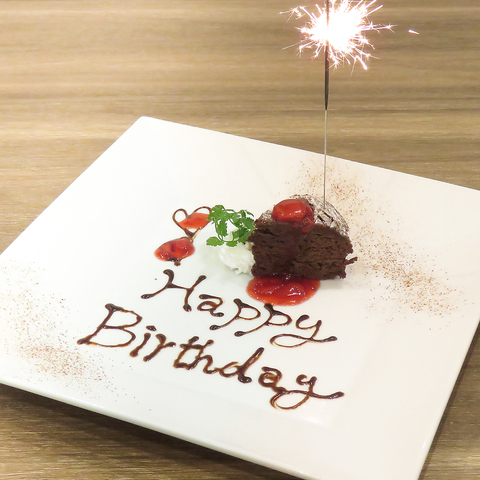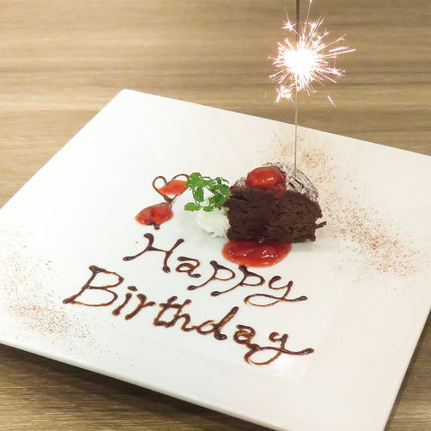 誕生日や記念日にぴったり!メッセージ付きデザートプレートをご用意できます。サプライズ演出もスタッフがサポート♪ご予約時にお気軽にお申し付けください。
