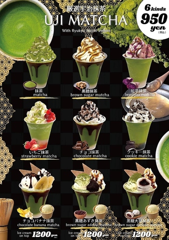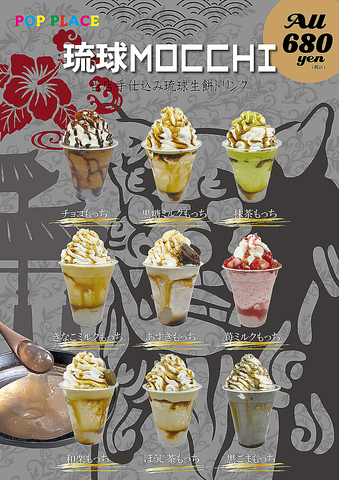 琉球生餅使用のもちもちで濃厚な抹茶ドリンクです。宇治抹茶を使用しています。レギュラーアイテム6種類、アイスのせアイテム3種類ございます。
