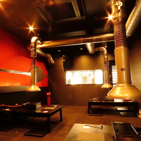 2階のお座敷席は、落ち着いた赤と黒のコントラストが印象的で、洗練された空間が広がっています♪低めのテーブルと座布団が配置されており、リラックスした姿勢で焼肉を楽しむことができます◎換気設備も整っていて快適に過ごせる環境が整っているため、特別なひとときを演出します。友人や家族との集まりに最適です!