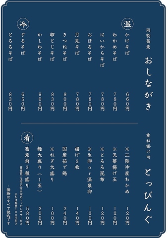 ディナータイムの晩御飯やナイトタイムの飲みのシメに!蕎麦前もあるので飲み足りない方にもオススメです。