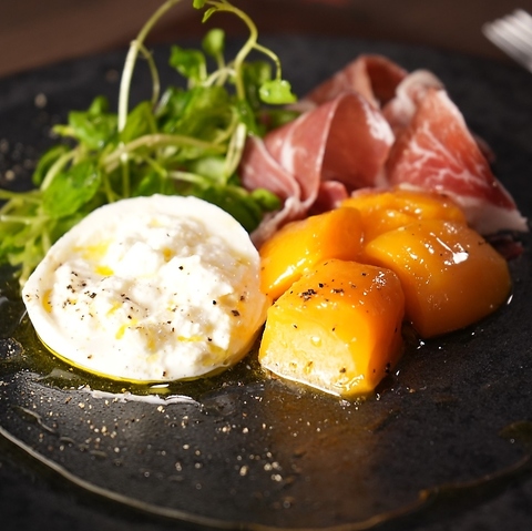当店の看板メニュー♪イタリア南部のフレッシュチーズと季節の果物を熟成生ハム・クレソンでサラダ仕立てにした一品です。