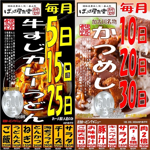 5・10・15・20・25・30日はぱっぱ屋がお得!牛すじカレーうどんorかつめしが何とほぼ半額のワンコイン!