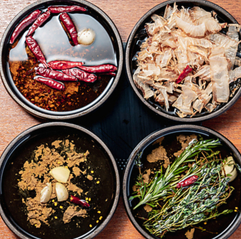◎ハーブ:数種類のハーブとニンニクを漬け込んだサラッとしたオイル◎かつお節オイル:アジロ特製!口の中に広がるかつおの旨みをお楽しみください!◎燻製オイル:オーリブオイルにスモーキーな香りをつけたオリジナルオイル◎辛しび:花椒とキャロライナリーパーを漬け込んだジワッとしびれる辛さ!