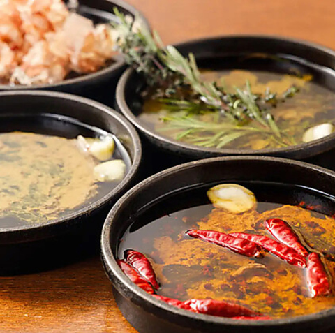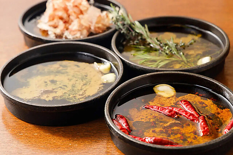 当店では、卓上IHを使用した体験型アヒージョが楽しめます。お通しで選べる4種類のオイル(ハーブ・かつお節オイル・燻製オイル・辛しび)にお好みの具材をトッピング!テーブルで調理できるので、熱々のままできたての美味しさを味わっていただけます◎ワインとの相性も抜群ですので、ぜひ合わせてご堪能ください。