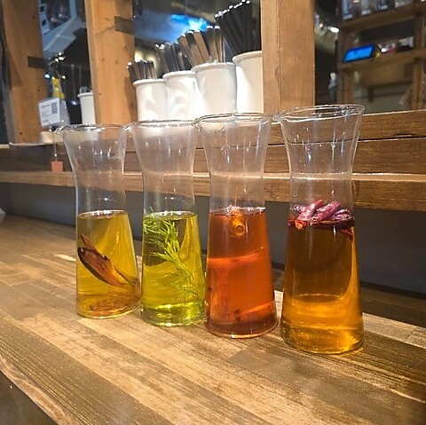 当店では、卓上IHを使用した体験型アヒージョが楽しめます。お通しで選べる4種類のオイル(ハーブ・かつお節オイル・燻製オイル・辛しび)にお好みの具材をトッピング!テーブルで調理できるので、熱々のままできたての美味しさを味わっていただけます◎ワインとの相性も抜群ですので、ぜひ合わせてご堪能ください。