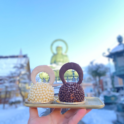 大仏ケーキ(ブラックブッダ/ホワイトブッダ)+お好きなドリンク+[お土産付]高岡銘菓!雪踏5種アソートがセットになってます!デートにもご利用いただけます♪大切な方とのひとときをゆっくりとお過ごしください。その他に、自家焙煎珈琲や県産小麦粉を使用したセットなどもございます。お好きなセットをご注文ください。