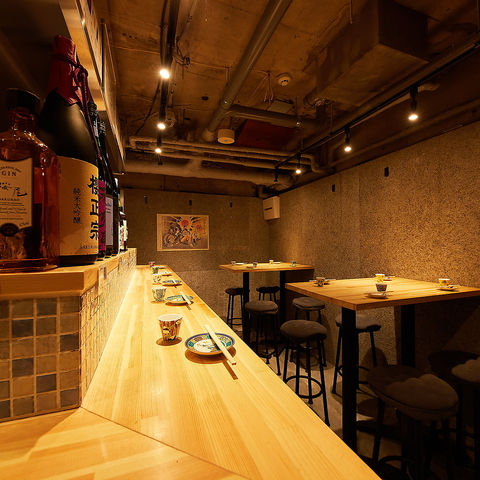 赤坂駅1番出口から徒歩二分!階段を下りた地下に店を構えているので隠れ家感もある当店。お一人様でも気軽に使えるカウンター席は、立ちと座りがございます。