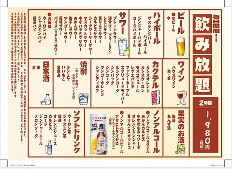 毎日お得な単品飲み放題は2時間1,980円(税込)生ビールをはじめ豊富な種類のお酒をお楽しみいただけます◎