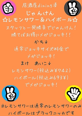 スタッフと一発勝負でじゃんけん!勝てばお得にレモンサワー&ハイボールのメガジョッキが飲めちゃいます☆