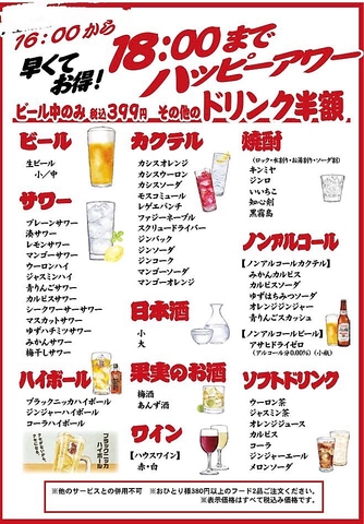 【早くてお得!】毎日16:00~18:00のご利用でビールは399円(税込)、その他のドリンクは半額で楽しめます!