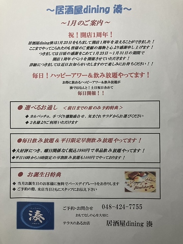 1月23日~1月31日の期間で開店1周年イベント開催♪ハッピーアワー毎日開催中!早割やお誕生日特典もご用意◎