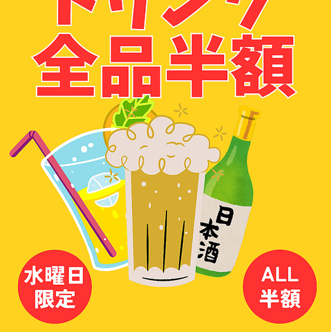 毎週水曜日は全ドリンクメニューが半額!!