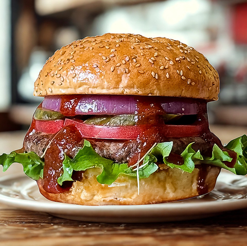 香ばしい香りがたまらない!ジューシーなパティにBBQソースがたっぷり絡んだ「バーベキューバーガー」。一口で幸せ広がる、オアシス自慢の一品です。