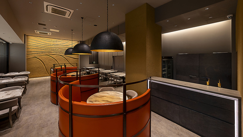 柔らかなオレンジ色のソファとシンプルなテーブルが配置され、リラックスできる雰囲気を醸し出しています。落ち着いたトーンの照明が、温かみを添え、食事や会話を楽しむのに最適な環境を提供。壁面のテクスチャーやディテールが、スタイリッシュな印象を与え、訪れる人々を魅了します。