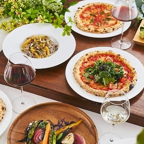 季節の食材をふんだんに使ったシェフ自慢の料理と、当店名物の自家製生地を使用した本格窯焼きピザをご用意しております。窯から焼き立て熱々のピザは、5種類+季節限定1種類をご用意。アート作品に囲まれた空間で、彩り豊かな料理をご堪能ください。