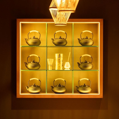 店内飾られている南部鉄器の急須。当店こだわりの和香園のお茶をグラスに注いでお楽しみください。