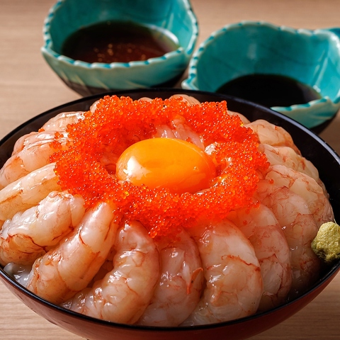 大きくプリップリの海老をたっぷりのせた赤海老は2人前ほどのボリュームで、シェアOK!!プリッとした海老に特製ダレや醤油、濃厚な卵黄などを絡め様々な美味しさを楽しめます◎