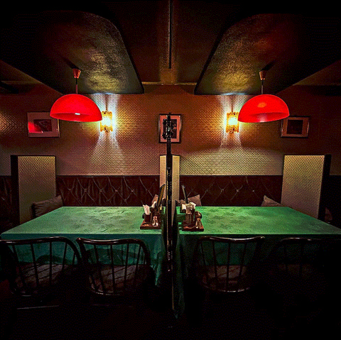 橙の行燈と緑のテーブルクロスに、藍色のパーテーション。面妖な趣きはそのまま、調和を目指したデザインに