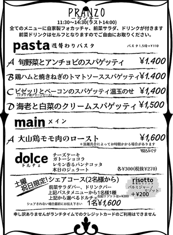 | 料金備考 | ランチは現金のみのお会計となります。 |