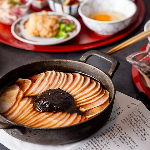 歌舞伎の演目にも登場する伝統味噌を使用した、銘柄鳥のすき焼き鍋。季節の食材を使ったお惣菜も各種ご用意しております。他では味わうことができない、かしわ鍋は特殊な製法で作られた味噌の凝縮された旨味とコクが、鳥肉の滋味と合わさり極上の鍋に昇華。他では食べられないかしわ鍋を是非ご賞味ください