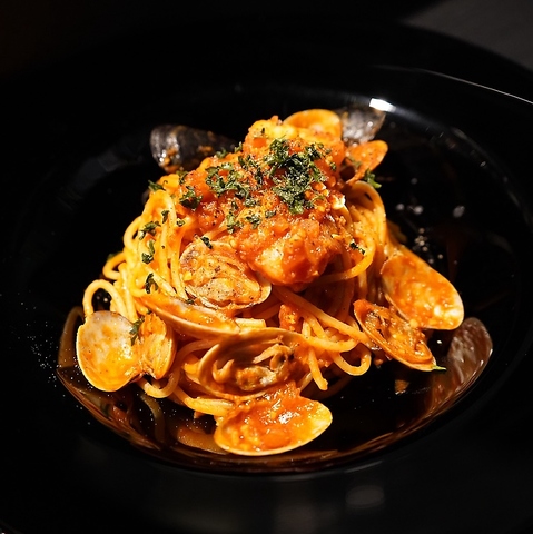 目の前に広がるのは、新鮮な海の幸がたっぷりと盛り込まれた、当店自慢の海鮮トマトパスタ。艶やかなトマトソースに絡むパスタは、まるでアートのような美しさです。貝類が彩りを添え、目を惹きつけます。見た目の美しさだけでなく、口に運ぶと海の風味が広がり、贅沢な味わいに感動することでしょう。ぜひご堪能ください!