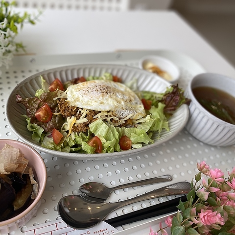 全部で糖質30g前後のお野菜たっぷり低糖質プレート*ロカボごはんなのに味もしっかり!スープ・デザート付きで満腹満足♪ +200円で500円までのドリンクをお付けできます。