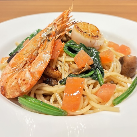 プリプリ海老と大ホタテを使った![絆]エビの旨みは殻にあります殻の香ばしさとプリップリのエビと優しい味わいのトマトバター醤油で合えました