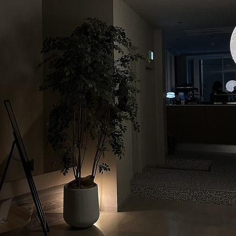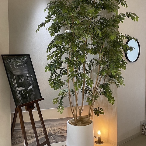 店内に入るとモノトーンで無機質な空間が広がっており、シンボルツリーが映えを演出しています。ビルの2Fにある穴場感溢れる空間で、友人同士でゆっくり過ごすのにも最適です。インテリアと合わせて写真を撮る方も多く、SNS映えもまちがいなし。