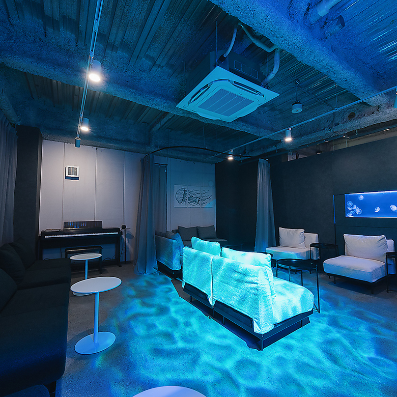 tayutaでは半個室を用意しており、最大7名様まで団体でのご利用が可能です。カーテンの仕切りから溢れる青の揺らぎ照明が幻想的な空間を演出します。飲み会の2件目や、始発待ちにぜひご利用ください◎また現在、結婚式の2次会、イベントスペースとして箱貸しのご予約も承ってますので、お気軽にDMくださいませ。