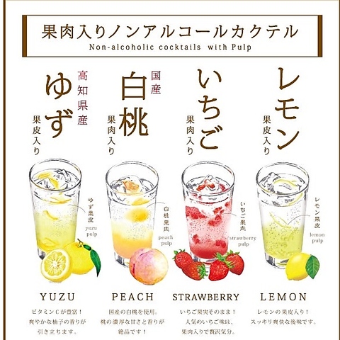 | soft drink | ウーロン茶/緑茶/ジャスミン茶/コーラ/ソーダ/ジンジャーエール/トニックウォーター/オレンジジュース/グレープフルーツジュース/カルピス/ミルク |