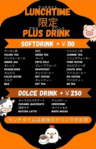 ランタイムは+110円でコーヒー・紅茶含むソフトドリンクがつけられます。+250円でキャラメルマキアート・抹茶ラテ・ホワイトモカ・チョコチーノといったドルチェドリンクセットも人気です。