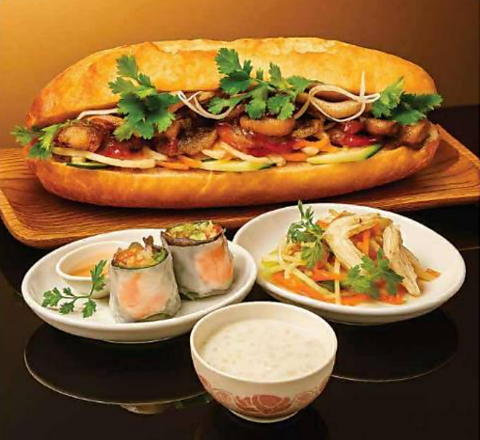 一番人気の焼き豚肉バインミーと生春巻き、チキンサラダ、デザートがついたお得なセットメニュー迷ったらまずこれ!!