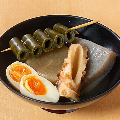 大阪天満から仕入れた100%北海道産昆布3種をブレンドした、こだわりの出汁を使用。おでんのタネは常時20種以上と豊富なラインナップ!旬の食材を取り入れ季節に合わせてご用意しており、年間を通して出汁の「うまみ」をご堪能いただけます。お好きなタネをご注文いただくもよし、盛り合わせで楽しむもよし。心に染み入る味わいをご賞味あれ!