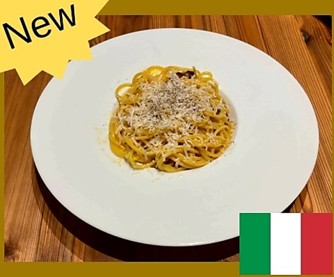 カルボナーラ発祥の地、イタリアローマで作られているレシピを再現しました。実は本場では生クリームは入らないって知っていますか?グランチャーレ(豚頬肉1k1万円)にペコリーノチーズと卵の絶妙なバランスをご賞味ください。