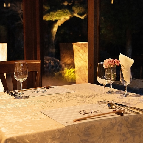 四季折々の木々や草花に彩られた庭園が照明に照らされ、幻想的な空間をお愉しみいただけます。全席から庭園を望むことが出来るため、ディナーの際は是非ご覧ください。