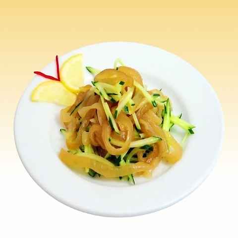 コリコリしたクラゲを、さっぱりとしたわさび風味で和えた一品。ピリッと辛くて爽やかな味わいが特徴です。