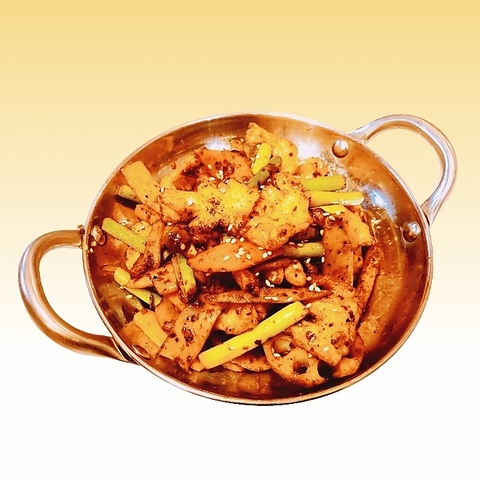 豚もつを香り高い山椒で仕上げ、ピリッとした辛さと爽やかな麻味が特徴の一品。食欲をそそるスパイシーな風味です。