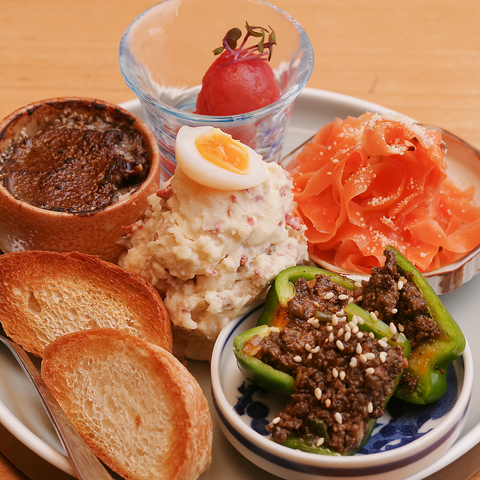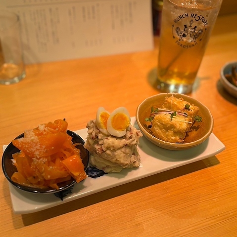 人気の選べるおばんざい、3種選んで1200円(税込)。5種だと1800円(税込)です!ホクホククリーミーなポテサラ、口溶けの良い滑らかな食感のレバーパテ、外は香ばしく中はふわっとした池嶋豆腐さんの厚揚げ、シャキシャキとした人参サラダなど様々なメニューをご用意しております。お好きなものを選んでワインと一緒にどうぞ…
