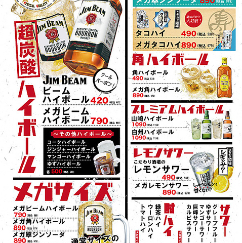 | ハイボール | 角ハイボール、メガ角ハイボール、ジムビームハイボール、メガビームハイボール、コークハイボール、ジンジャーハイボール、マンゴーハイボール、ゆずハイボール |