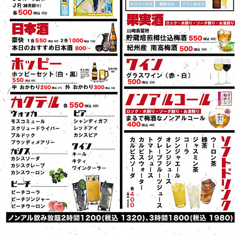 | 料金 | アルコール飲み放題2時間飲み放題2420円(税込)3時間飲み放題3630円(税込)ノンアルコール飲み放題2時間飲み放題1320円(税込)3時間飲み放題1980円(税込) |