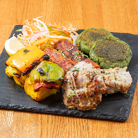 チキンマライティッカ、パニールティッカ、シークケバブ、ハラバラケバブの4種類を一皿に
