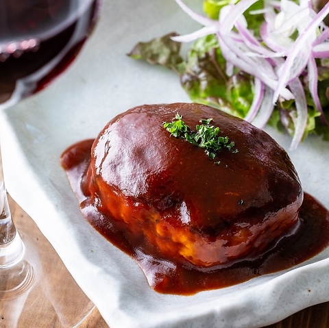 じっくりと煮込まれた自慢のハンバーグは、柔らかくなった肉の食感が多くの人々を魅了する当店でもおすすめの逸品。ソースがしっかりと染み込み、深い味わいを楽しむことができます。ふわりと広がる匂いは食欲をそそり、お酒との相性もバッチリ◎